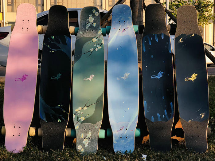 滑板主要是由板面、橋(支架)、輪子、軸承、砂紙等組成。而板面是滑板辨識(shí)度最高的部分,不同的板面材質(zhì)和圖案帶給人不同的感官體驗(yàn)。現(xiàn)在的很多的玩具滑板,主要也是靠“顏值”獲得了不錯(cuò)的市場(chǎng)銷量,甚至超過(guò)專業(yè)滑板。那也是為什么滑板廠商越來(lái)越重視板面圖案的設(shè)計(jì)和制作,也讓UV平板打印機(jī)這種換圖靈活、無(wú)需制版、即打即干的工具應(yīng)用到產(chǎn)品制作過(guò)程中。